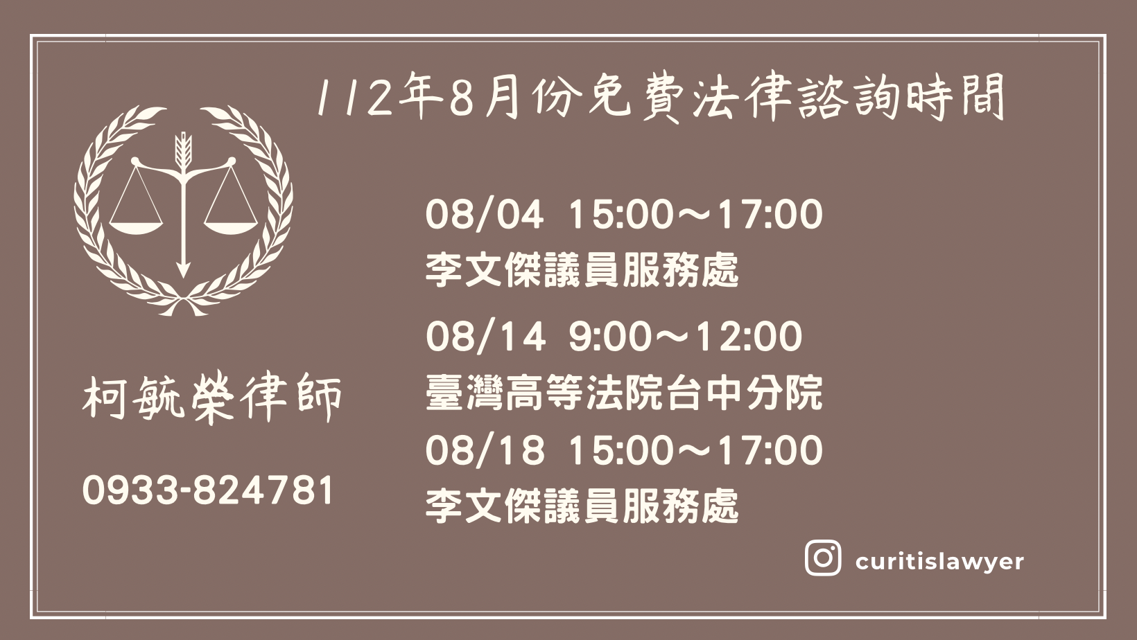 #法律諮詢 #法律 #律師 #免費法律諮詢 #免費法律諮詢服務#法律事務所 #諮詢 #法律諮詢律師 #柯毓榮律師 #台中 #南投 #彰化 #苗栗 #雲林#大甲 #大安 #外埔 #后里 #清水 #沙鹿 #海線#台灣 #全國 #法律顧問