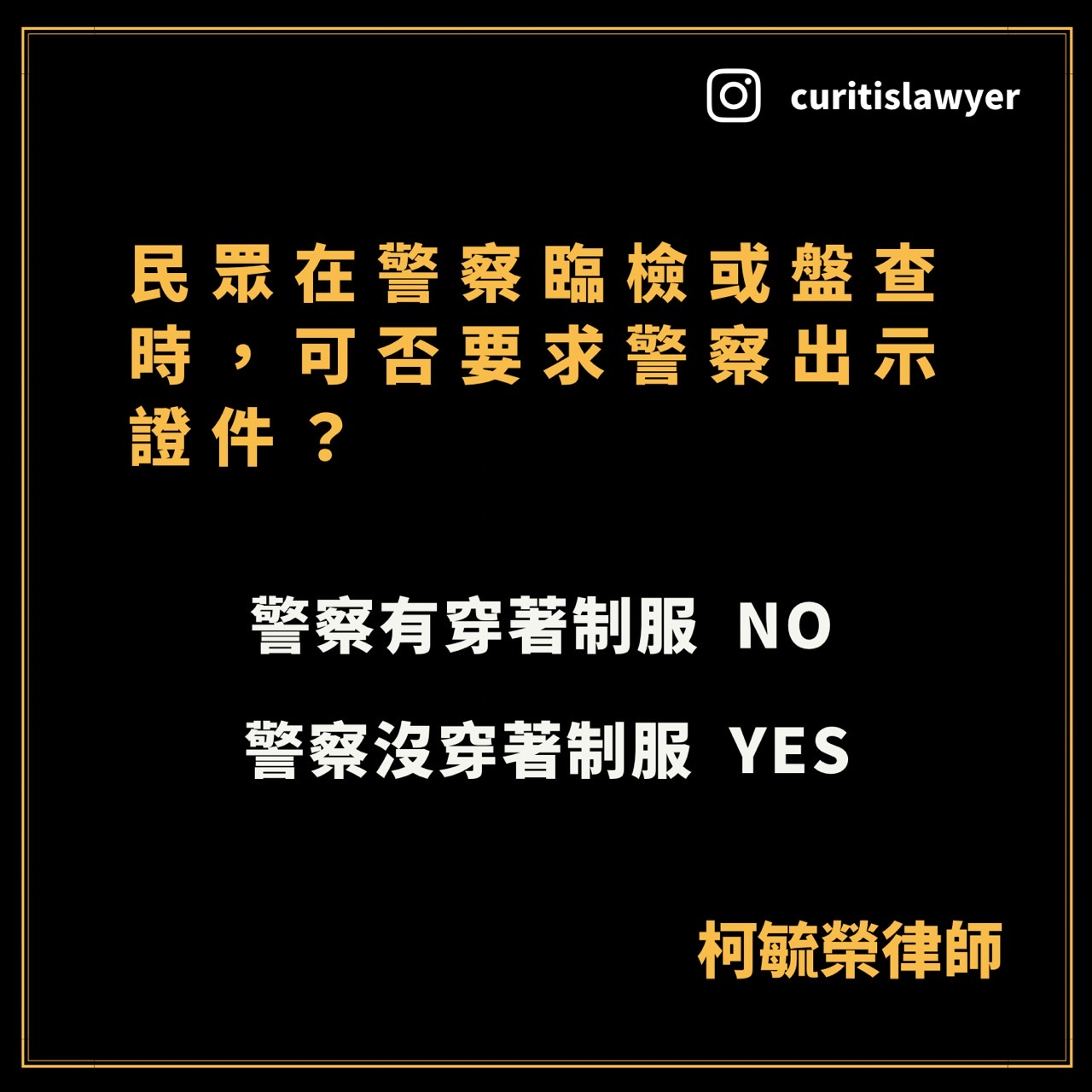 - 由警察職權刑事法第4條,可以知道警察行使職權時,應著制服或出示證件表明身分,所以如果警察有穿著制服,民眾就不能要求警察出示證件表明身分,反之,如果警察沒穿著制服,民眾就可以要求警察出示證件表明身分